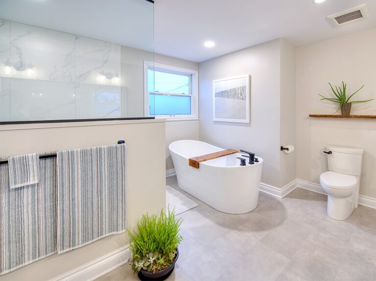 A customer-built bench for the freestanding soaker tub added the perfect finishing touch to the project. This bespoke addition not only enhances the functionality of the space but also adds a unique and personalized touch that sets this renovation apart.
