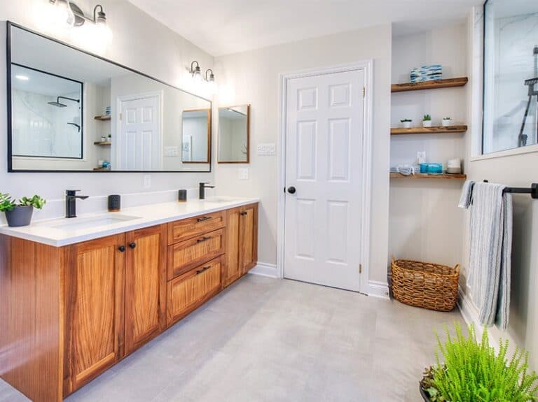 Adding to the warmth and sophistication of the space is the walnut finish chosen for the vanity and floating shelves. This rich tone adds depth and character to the room, creating a welcoming atmosphere that invites relaxation and rejuvenation.