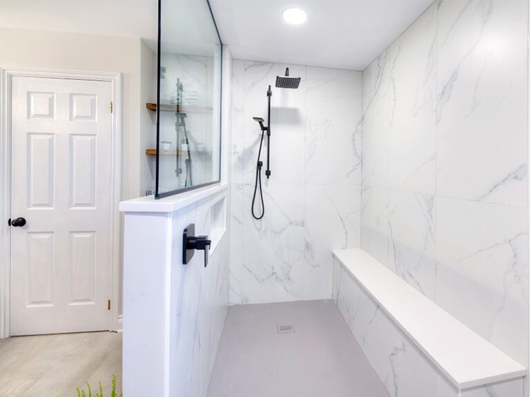 The removal of a large drop-in bathtub and oversized deck allowed for a spacious walk-in shower. Measuring an impressive 66” x 56”, this shower features a slab base and large format tiles, selected for easy cleaning and a modern aesthetic. The elegant matte black finishes complement the timeless beauty of the Calcatta tile, adding a touch of sophistication to the space.